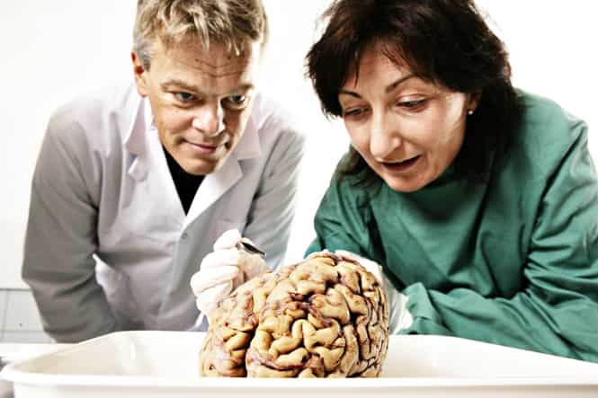 Norwegian scientists May-Britt Moser and Edvard I Moser with a human brain at the Kavli Institute for Systems Neuroscience of the Norwegian University of Science and Technology in Trondheim, Norway. (AFP Photo)