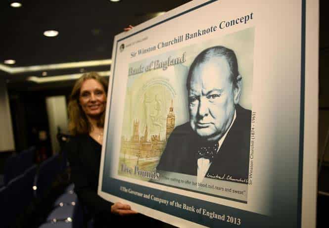 Bank of England's Head of Notes Division Victoria Cleland, shows off the concept design of the new polymer five-pound banknote after a news conference at the Bank of England in London. AFP photo