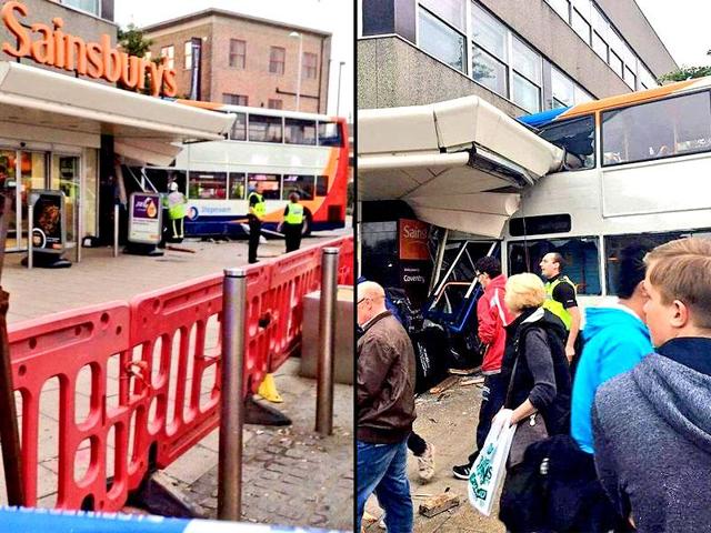 The bus crashed into several cars and a lamppost before hitting the supermarket on what would have been a busy shopping day in the city centre.