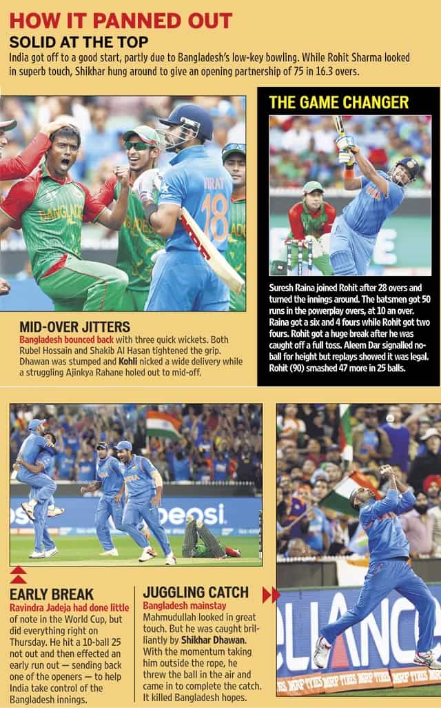 In another debatable incident, Shikhar Dhawan seemed to touch the boundary rope while taking a catch to dismiss in-form batsman Mohammad Mahmudullah for 21 in the 17th over. Even though replays were inconclusive, the third umpire gave the decision in India's favour.